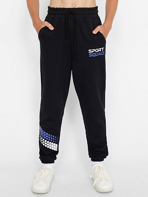 Брюки для мальчика с карманами. Пояс притачной, с резинкой и функциональным шнуром. Нижние срезы брюк на резинке. В области левого кармана небольшой принт "СПОРТИВНАЯ КОМАНДА"с эффектом высокой базы. Правая половинка брюк декорирована принтом.