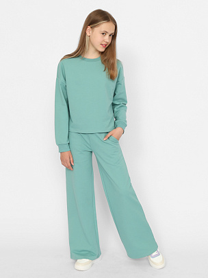 Джемпер для девочки с длинными рукавами и спущенными плечами. Горловина обработана воротником-стойкой из полотна с эластаном. Рукава с эластичными манжетами. Перед джемпера декорирован принтом.
