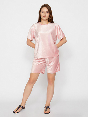 Костюм изготовлен из высококачественного бамбукового велюра. Футболка свободного силуэта с коротким рукавом, шорты свободного кроя с поясом на мягкой резинке. Ткань переливается и меняет оттенок в зависимости от освещения. Костюм женский подчеркнёт индивидуальность, привлекательность и нежность своей обладательницы.