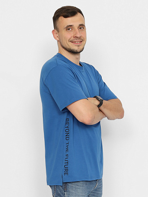 Футболка с коротким рукавом. Горловина круглая, обработана узким воротником из полотна с эластаном. Перед оформлен принтом.